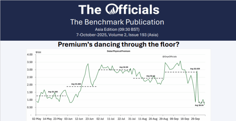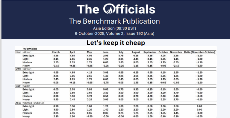 They don’t like to be predictable! The Saudis kept November OSPs for Extra Light and Light to Asia flat from October, at the average of Dubai and Oman +$2.50 and +$2.20, respectively. Medium and Heavy were each cut by 30c.