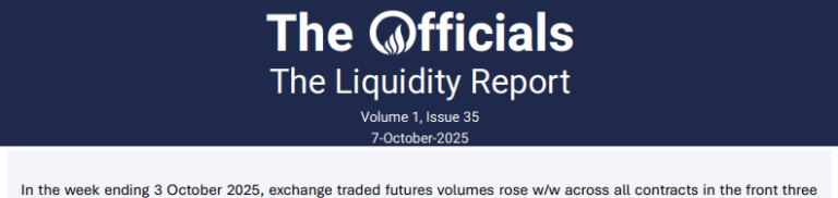 In the week ending 3 October 2025, exchange traded futures volumes rose w/w across all contracts in the front three tenors, except the December and January WTI futures.