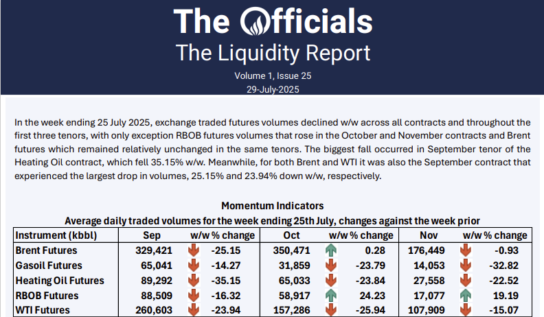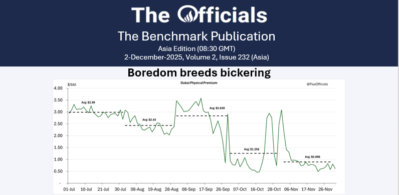 The North Sea physical differential climbed around $0.70/bbl this week, a significant shift from the negative diffs at the start of November. However, last week’s buy-side bias **has now turned shakier.** We saw a trade house sell-side of Dec weekly rolls and Dec/Jan’26 DFL last week. This flow dissipated as the physical inched higher, with 28 Nov instead seeing a trade house aggressively bidding 1H Dec into 2H Dec rolls. It appears that the prevailing regime has shifted again this week. We saw a trade house flipping to a sell-side axe in Dec'25 weekly structure on 01 Dec, leading to a sell-off in prices exacerbated by thin liquidity. The Bal-Dec’25 DFL fell from a high of $0.87/bbl on 28 Nov to $0.69/bbl on 01 Dec, where it met support and climbed to $0.75/bbl. The 01-05 Dec three-week roll sold down to $0.70/bbl, with the Bal-Dec/Jan’26 DFL roll standing at $0.22/bbl on 01 Dec. We saw similar sell-side interest on 02 Dec, with selling in the 15-19 Dec CFD and 15-19 Dec vs Cal Jan roll, with only some buying in Bal-week CFD and the 15-19 two-week roll supporting prices. Returning to the physical differential, although we continue to see the usual suspects buying the physical, prompt offers have been increasingly aggressive, casting a doubt on the robustness of this strength. We see relative support from the 8-12 Dec CFD, indicating that we may see some near-term support; however, it will be vital to monitor how sentiment shifts in the coming week.