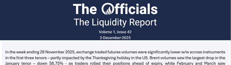 We have seen trading volumes remain extremely low in December. This week, the M1 Brent/Dubai remained in its tight range between -$0.90/bbl and -$0.55/bbl, as it has been for most of November, as it moved sandwiched between the 100-day and 200-day moving averages. The bodies on the candles are short and fail to reveal a pattern, but there has been a trend of higher lows d/d this week. On the other hand, the shadows on the candles shifted from being longer underneath the candles to above them. This shows that although there is better buying at the lower end of the range, there is better selling at the upper end. The market is still lacking any concrete directional consensus, with a limited risk appetite clear in the price action. As we approach the end of the year, the current de-risking is reflective of a market averse to further market uncertainty. The forward curve has started to flatten out, with Brent/Dubai contracts sitting between -$0.65 and -$0.35/bbl through most of the 2026 curve. There seems to be little to indicate a breakout without some fundamental changes, or a ceasefire between Russia and Ukraine, although the continued failure of these talks has built in some headline scepticism around the subject. Nevertheless, the current environment suggests a trend toward de-risking.