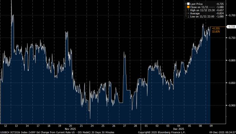 Meanwhile, the Fed is set for a third cut tomorrow, but support for more easing is thinning out, now only 72bps of cuts priced in the next 12 months, compared to over 90 bps at the end of November (Figure 2). USTs cheapened a little ahead of FOMC with 10yr pinned in its 4.00–4.20% range. NY Fed survey shows inflation expectations steady but household sentiment souring.