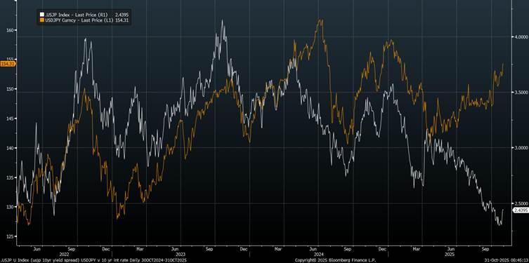 In Japan unemployment rate picked up to 2.6% and the labour force participation continued declining! Inflation came really hot at 2.8% – above expectations – the markets are slowly ramping up their bets for another hike by the BoJ. Expect the gap on Chart 2, Bloomberg to tighten as the interest rate differential (white line) remains well below historical levels, while the USD/JPY should weaken with monetary tightening. But housing starts and construction orders in Japan remain an issue!