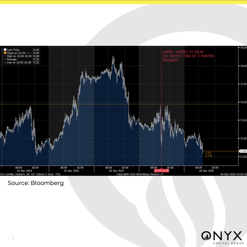 OPEC+ held a ministerial meeting on Thursday to decide whether to keep the status quo on its current supply policy. The swift outcome of the meeting confirmed what the consensus had been thinking all along. OPEC+ delayed the unwinding of voluntary cuts for a third time to April 2025, and it plans, if market conditions allow, for the 8 OPEC+ members to start unwinding these discretionary cuts incrementally thereafter. The duration of the tapering of cuts was extended to the end of 2026. The UAE, which had been granted a production increment of 300 kb/d in 2025, would delay a rise in its output till after Q1 next year. With oil prices just about hovering above $70/bbl, a weak short-term macroeconomic outlook and a fair amount of uncertainty for the world economy when President-elect Trump takes office in January, OPEC+ has bought itself some time to gain more clarity. The market’s reaction to the decision was volatile, declining to $70.81/bbl intraday to quickly bounce back above $72.50/bbl, only to finish slightly lower on the day. The whipsaw, in part, could have been provoked by option hedging flows around the event, but from a sentiment point of view, the OPEC+ decision did not shift the fundamental outlook for prices to move strongly either way. Compliance with quotas remains a big challenge, with some producer group members, like the UAE, producing considerably above target or others, like Iraq, having to implement compensatory cuts for earlier overproduction. Has OPEC+ done enough to assuage market bears? That remains to be seen in view of the downside risk to demand outlook and robust growth in oil liquids supply in non- OPEC countries.