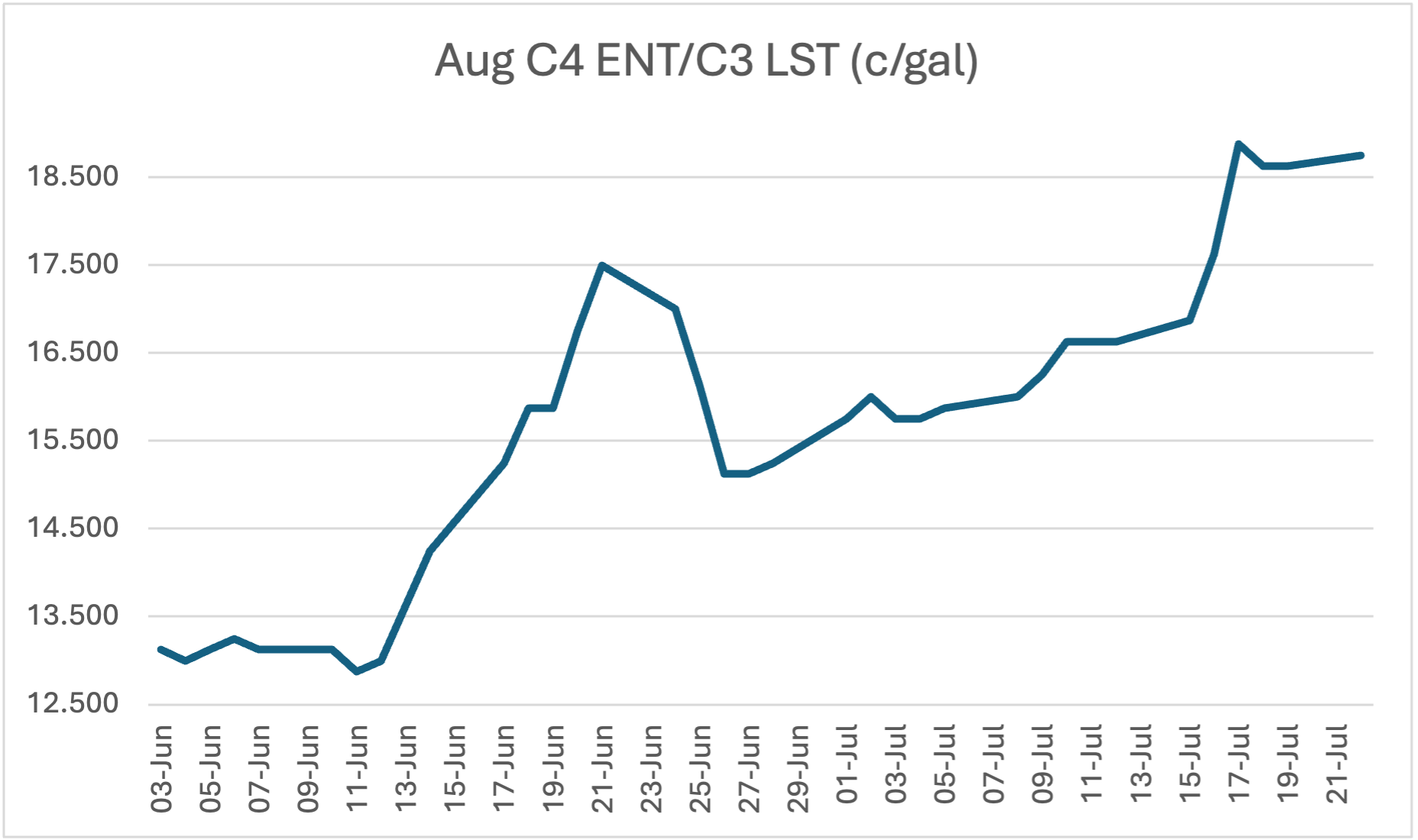 In addition, the August contract for the differential between n-butane and US Mont Belvieu (LST) propane rallied from 13c/gal on 12 June to 17.50c/gal on 21 June.