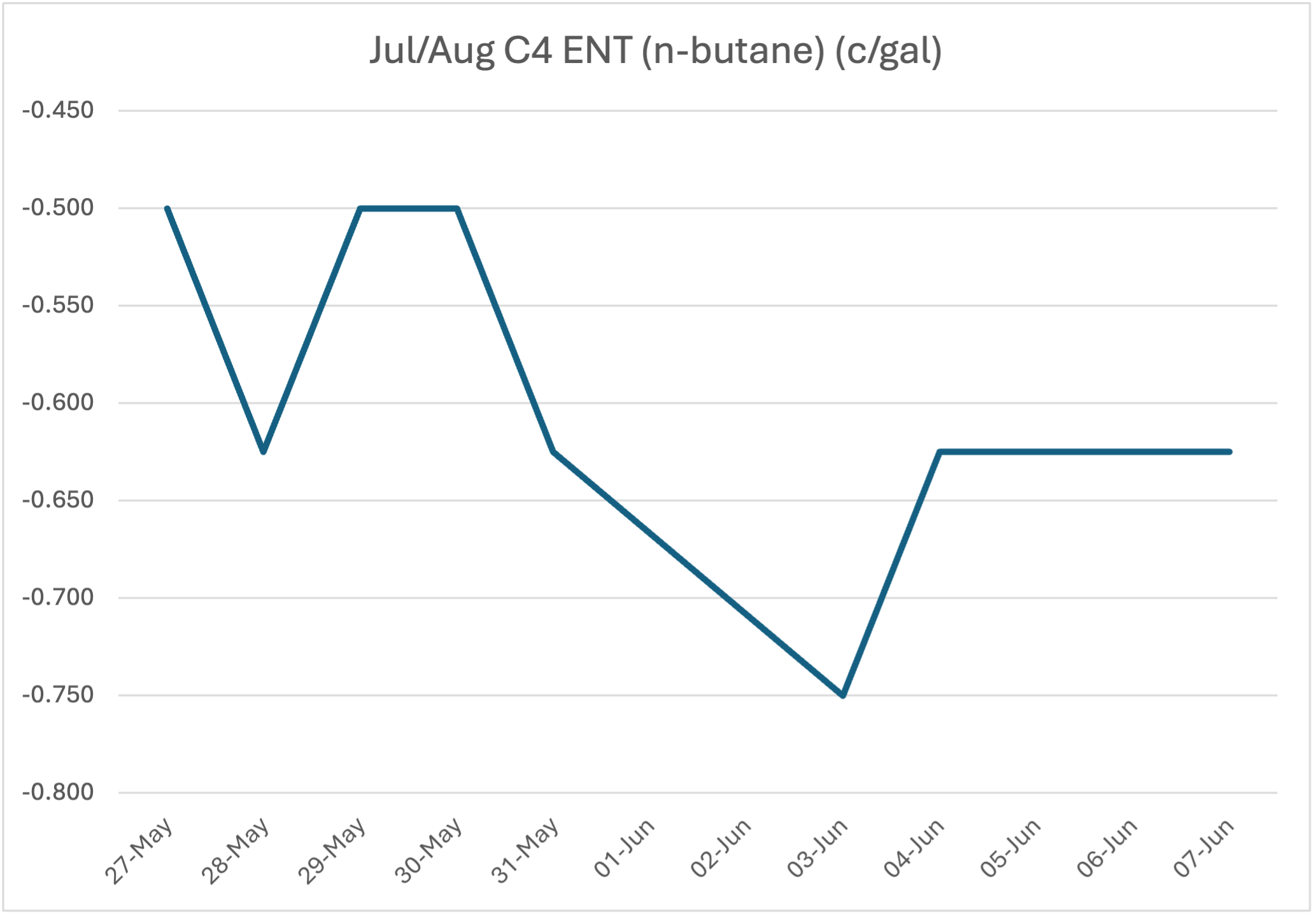 This year, however, US butane unseasonably rallied in June. We saw the Aug/Sep C4 ENT spread climb from -0.50c/gal on 10 June to +0.125c/gal on 19 June.