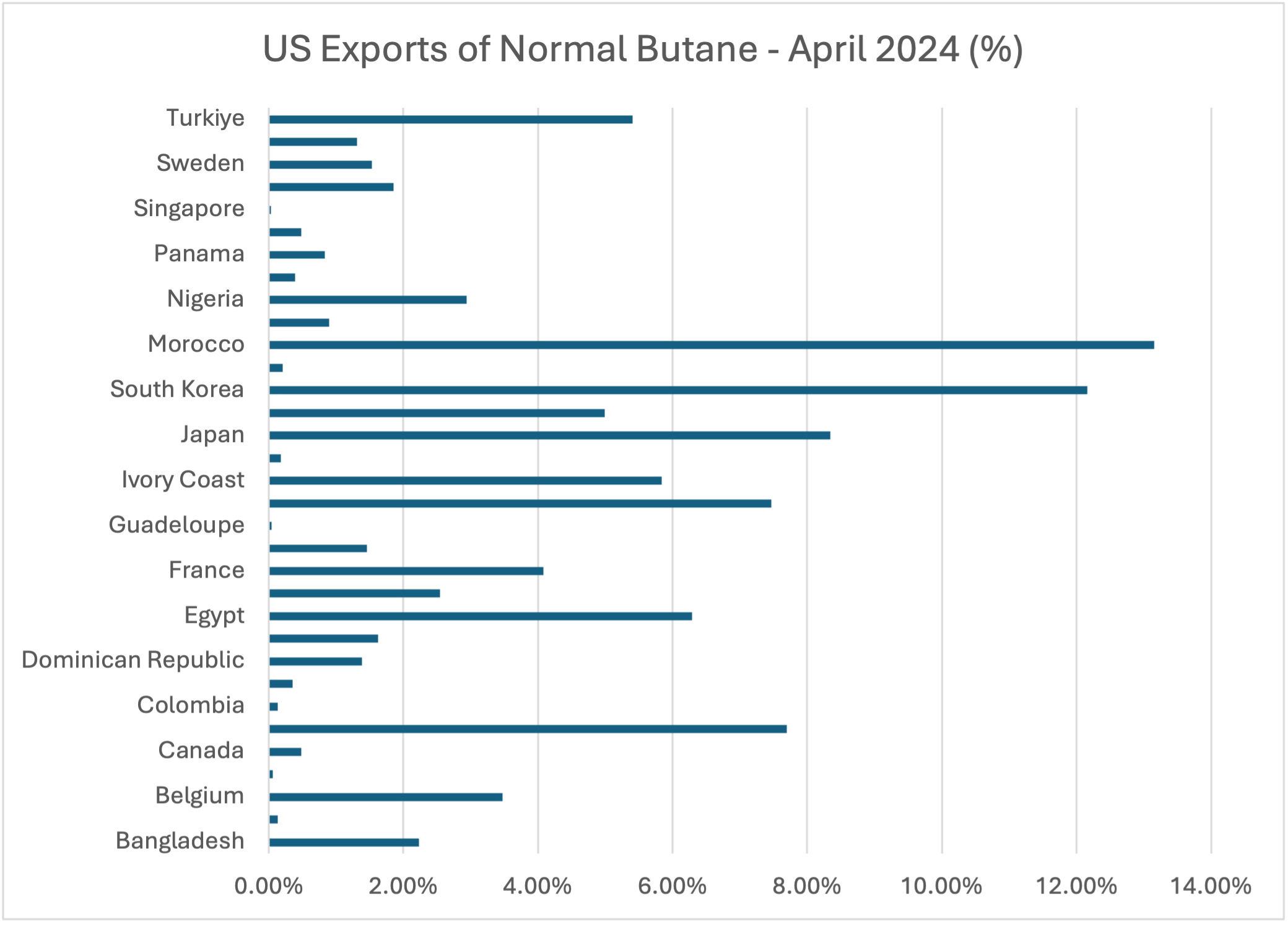 This increase in profitability and demand for butadiene would translate into US butane due to the region’s prowess as a butane exporter. The EIA reported a dramatic rise in US exports of normal butane this year, with April 2024 recording this level at 547kb/d. Looking deeper into these exports, China, Japan, and South Korea made up 30% of all exports.