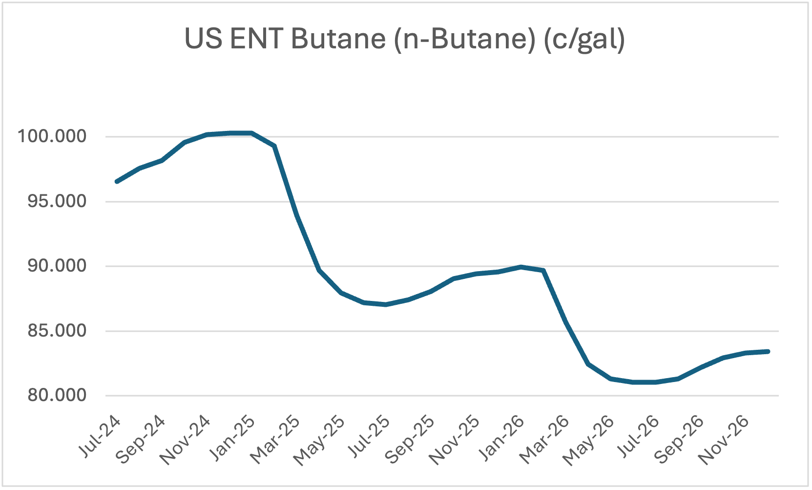 Let’s take US butane, for instance. Normal butane, also known as C4 ENT, tends to inflate in the winter due to rising demand for various reasons, such as heating fuel. In addition, the wintertime gasoline blending pool adds more butane to gasoline due to its boiling point, which increases its Reid Vapor pressure (RVP), allowing the fuel to evaporate at low temperatures. Due to this rise in usage, butane is characteristically known to inflate in the winter and become cheaper in the summer.