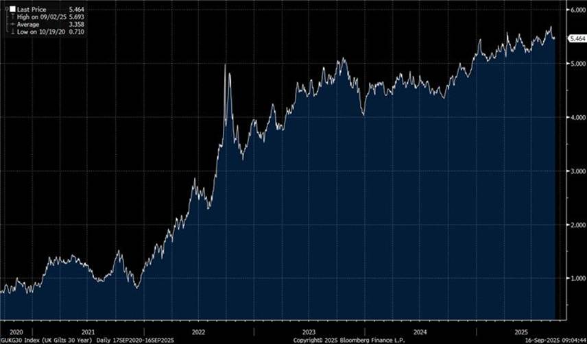 The Bank of England is set to slow its quantitative tightening, trimming gilt sales from £100bn to below £72 billion annually, while keeping rates steady at 4%. The move reflects bond market volatility and rising borrowing costs, with the BoE noting QT’s impact on financing conditions remains modest. The 30-year gilts are trading near 5.5% – the highest among G7 countries (Chart 2, Bloomberg). The UK is in need of more money, but the fiscal concerns are costing even more. The recently issued 10-year gilt showed that an additional 8.25bps on the yield resulted in a £100 million loss of additional funds!