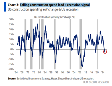Hartnett BofA: Falling construction spend lead = recession signal (Chart 2, BofA Global Research)