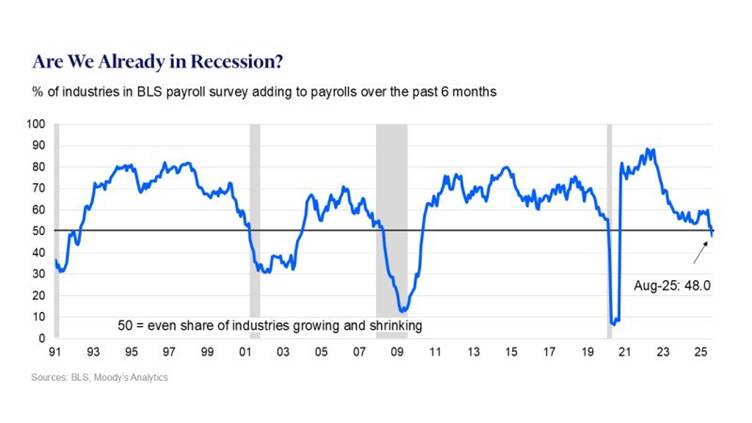 Also, fewer than half of the industries in the Bureau of Labor Statistics’ payroll employment survey have added to payrolls over the past 6 months. As is evident in the graph below (Chart 1, BLS, Moody’s Analytics) this only happens when the economy is in recession.