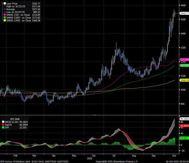Gold continues its relentless climb, hitting a fresh high above $4,240/oz before easing slightly. ANZ now sees the metal reaching $4,400 by end-2025 and $4,600 by mid-2026 as rate cuts stack up. Silver too remains buoyant around $53/oz, up 14% this month amid razor-thin liquidity in London. Palladium hasn’t been left out in the recent parabolic rally across precious metals, but is the rally stalling? The MACD is rolling over, indicating bullish momentum is falling. (Figure 2, Bloomberg)