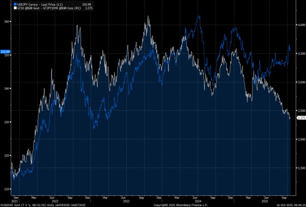 Central bank rhetoric remains in focus. In Tokyo, BoJ board member Naoki Tamura reaffirmed his hawkish stance, saying policy rates should rise toward 1%, arguing the current 0.5% setting is still well below neutral. Meanwhile, Fed official Stephen Miran admitted he’s yet to win over colleagues on the need for faster and deeper US rate cuts, despite signs of labour market softening. Now the interest rate differential between US and Japan is at its lowest in over 3 years and it still has room to go down, while its correlation with USDJPY continues its divergence. (Chart 1, Bloomberg)