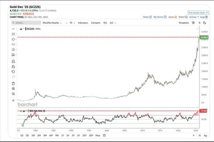 Gold is trading -0.4% lower on the day after reaching its new all-time high of $4179.3/oz in the early morning trading. However, December futures have now reached the most overbought levels in history after reaching a monthly RSI level of 91.8 (Graph 1, Barchart). Expect at those levels funds taking profits!