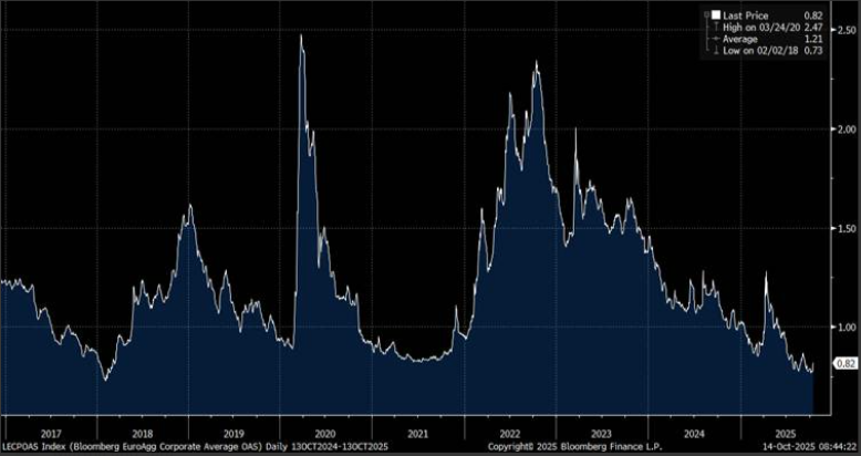 ECB Supervisory Board Chair Claudia Buch said Monday. “One of the things we see is that risk premia are relatively compressed right now and valuations are also relatively high and this is why we have been arguing we need sufficient resilience in case market sentiment changes”. Bloomberg’s European credit spreads remain tight, around the lowest in 2018 (Chart 3, Bloomberg).