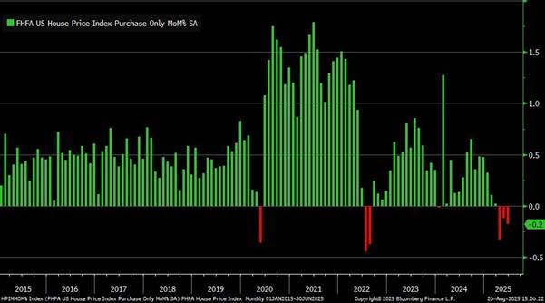 US House Price Index from FHFA contracted for a third consecutive month in June (hasn’t happened since 2011. (Chart 2, Bloomberg, @LizAnnSonders). With the Year/year change in median price of new single-family home fell to -5.9% in July