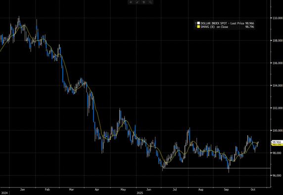 Other big news of course was the precious metal sell off, gold and silver down yesterday -5.3% and 7.3% respectively, golds biggest fall since 2013. Gold even fell to dead on $4,000 over night before bouncing (yesterday’s high $4,375). But the other key price everyone seems to be missing is the rally in the US dollar. (Chart 1, Bloomberg) The first nine months of 2025 was ‘SELL DOLLAR’ headlines, but now we’ve seen a clear double bottom, and are witnessing another squeeze of a crowded trade.