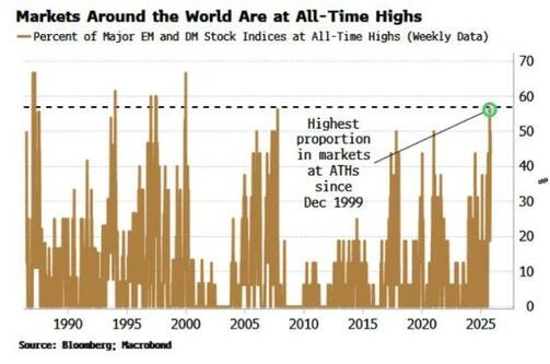 But elsewhere the party is still going – the question is how long until the music stops? Globally the proportion of stock indexes at an all-time high is the highest since 1999! (Graph 1, Macrobond)