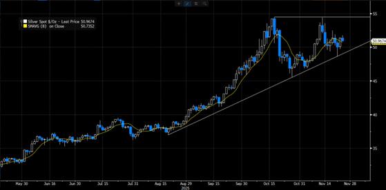 Gold and silver bounce off perfect support line. Silver here targets $54.48 double top breakout level (Chart 3, Bloomberg)