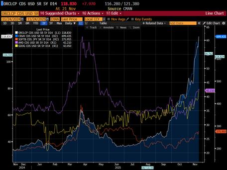 With Oracle and CoreWeave CDS surging, other AI CDS are also nudging higher, nothing concerning for now, especially if the Fed cut 25bp and with seasonal year end buying, but the risks are there, and the market remains (very) concerned about how all this planned AI CAPEX will be funded. (Chart 1, Bloomberg)