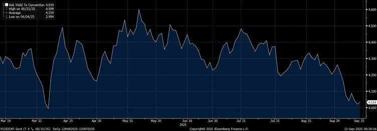 Treasuries welcomed the weakness, with the 10-year yield sliding to 4%, its lowest in 5 months (Graph 2, Bloomberg). The OIS market raised the stakes, now expecting a cut at each of the next two Fed meetings and over an 87% probability of a third cut by year end! While the DXY fell from above 98 to 97.50 this morning.