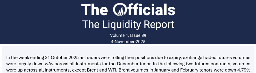 In the week ending 31 October 2025 as traders were rolling their positions due to expiry, exchange traded futures volumes were largely down w/w across all instruments for the December tenor. In the following two futures contracts, volumes were up across all instruments, except Brent and WTI. Brent volumes in January and February tenors were down 4.79%