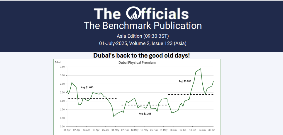 If you were used to June’s Dubai window, forget what you knew… Today we saw a staggering 68 partials traded and PetroChina is back – back on the sellside big time! And guess who’s back on the buyside? Yep, it’s the Vitol and PC show again – they’ve already hit two convergences in this first window, with PC nominating two Upper Zakum cargoes! PC sold 59 partials today, Glencore sold 7, while Reliance and Hengli one apiece. Vitol was buyside for 59 trades (though not all with PC), while Exxon picked up 6 and Gunvor bagged the other 3. A white-knuckled window after the somnambulance of June saw the Dubai physical premium jump 28c to $2.95 – though it’s still lower than its peak of $3.40 on 23 June.