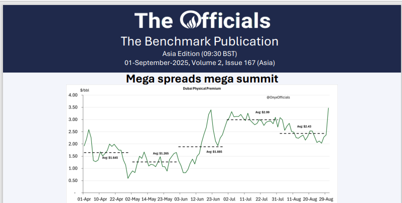 Super Dubai! We kicked off September trading with a bang, as the physical premium jumped to $3.47, the highest since February 28! In the window, it was standoffish, as buyers bid at $70.70 and sellers offered $70.80, with neither willing to shift. Only Vitol crossed the gap, lifting Mercuria’s $70.80 offer. The sellside was sparse, as some familiar faces eased off: just Unipec, Mercuria and Exxon offered. The buyside was more energetic: Vitol, Mets, Phillips, Exxon and Gunvor all showed up. Flat price was strong, ‘and if you wanted confirmation, the Dubai spreads were very strong,’ said a trader.