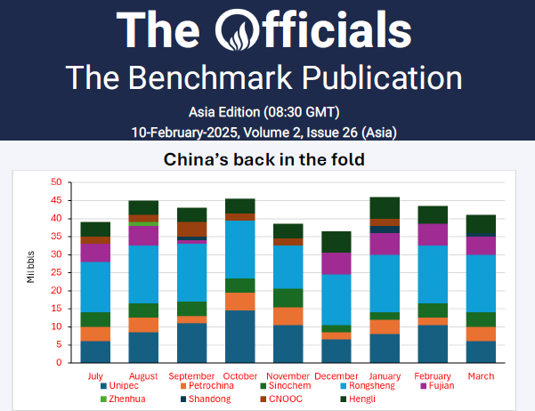 Later today, The Officials will publish a liquidity report on exchange traded volumes, so keep an eye on Onyx Hub, X and LinkedIn to discover our newest report and findings! In the meantime, Unipec’s Saudi allocation fell to 6 mil bbls, from 10.5 mil bbls in the February allocation. But Petrochina seesawed from 2 million bbls in February to 4 mil bbls in March. Overall, the allocations fell 2.5 mil bbls to 41 mil bbls, their lowest since December. Of course, Rongsheng is still the biggest recipient, after all they are a joint venture partner, with a steady 16 mil bbls for the past 3 months. It’s all go among Middle Eastern producers – don’t forget ADNOC OSPs released on Friday. Murban is priced at $80.22/bbl but the big surprise is that Upper Zakum is priced at Murban +$0.10! That’s to say $80.32/bbl, while Umm Lulu is Murban +$0.25 and Das is Murban -$0.40. And don’t forget fuel oil is looking good, providing support to some of the heavies. This is on a relative basis as Dubai is still inflated post Totsa’s squeeze.
