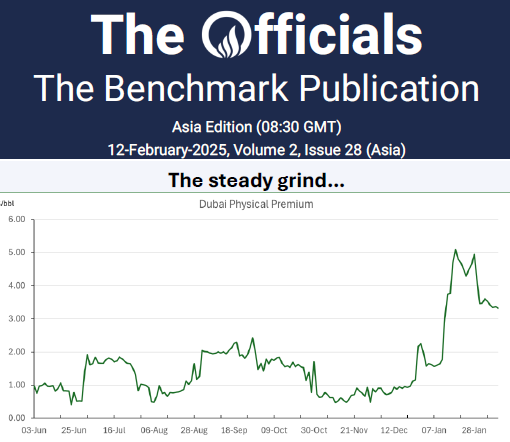 Our sources in China report that one cargo ready to discharge to the account of PetroChina was affected by the prompt enactment of the 10% tariff on crude imports from the US. Including the freight cost, PetroChina would face a tariff bill around $8.00/Bbl. This would force PetroChina to redirect the cargo elsewhere. But separately our sources in Beijing say, not too many cargoes are scheduled to ship in from the US. So, regarding tariffs, one source says, “ready steady, go”. The Dubai window has really settled into a pattern for February: lots of bidders outnumbering the sellers, but nobody stepping up to set the pace, all afraid to pick up the Totsa mantle. On the sellside, only Chevron and Reliance actually got involved today, while the buyside was awash with bidders – the usual suspects, Vitol, Equinor, PetroChina being some of the most active – raising bids, but they seemed largely to concur that sellers were asking for too much.