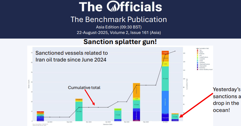 Sanctions, sanctions, sanctions… that’s the summary of the US approach these days. The US Department of State added 8 new ships, a port and a storage company to the naughty list – see details on the details page! The incremental impact is small, as the list of sanctioned vessels is pushing 165 since June 2024. We’re not sure what the game is here since a lot of the vessels have alternative insurance and they are lawful conveyances at the load and discharge port. The impact is lost, and it’s just an annoyance, and does not change anything whatsoever. Traders noted the sanctions came after an FT article, allegedly sourced from entities related to Washington. From a journalistic point of view independence is questioned.