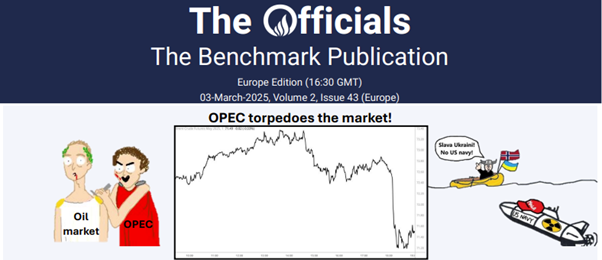 The Ides of March! Markets collapse! Or to put it more bluntly, OPEC torpedoed the market. Brent closed at $72.56/bbl. But the real action happened after the European close as Brent collapsed by over 2% to $71.20/bbl by press time after an OPEC delegate said the group will go ahead with a 138 kb/d production increase from April! This is the first increase and a prelude of the return of 2.2 mil b/d over 18 months. An executive at a trading firm saying, “Time to test 70 again”.