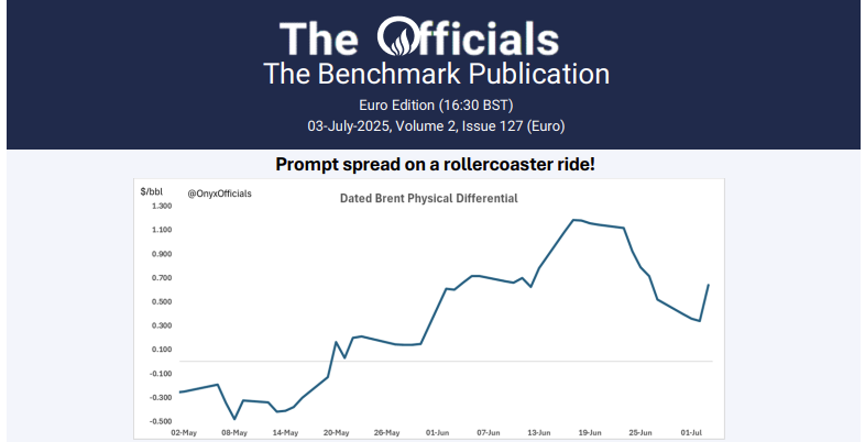 Mercuria was back in the North Sea window, dangling another Midland offer in there. But they offered a 26-30 July Midland at $2.10 over Dated early in the window and then left it to rest there, though it attracted no interest at all. And finally we saw a bid for Forties! After Totsa cleared out Shell’s Forties offer a couple of days ago, Unipec came in today to bid Forties at Dated +$1.30 – massive! It was also a very wide bid, for 13-31 July… And the physical differential jumped to 64c!
