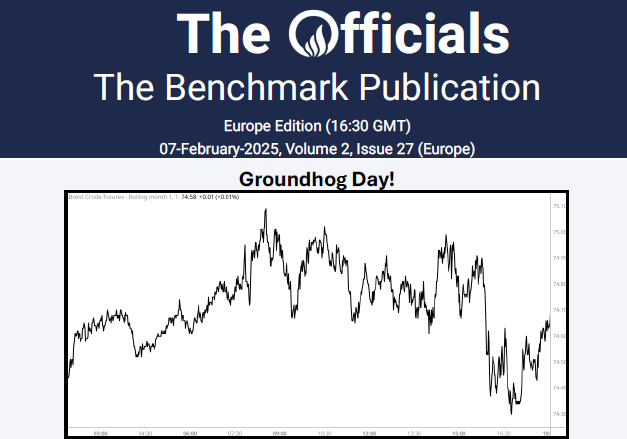 Like yesterday, the European morning saw lots of lateral movement as Brent flat price fluctuated mildly in the gentle market wind, like those idling wind turbines in Germany… Today, $75 really was the ceiling, as flat price bounced along in the upper $75 range, edging above $75 for the close of the Asian session this morning but otherwise failing to smash through that glass ceiling. Flat price plunged in the window, dumping to $74.46/bbl at the close. The North Sea window was another Midland fest. Early on, Gunvor and Equinor barged in, trying to get yet more Midland off their hands. Equinor was really keen to shift Midland, offering a 25 Feb-1 March cargo down to Dated +$0.70. Gunvor apparently liked the look of that enough to flip from the sellside and grab it. But Gunvor kept its own Dated +$1.25 Midland offer on the table. That’s not the first time we’ve seen Gunvor offering yet opportunistically buying. Bargain hunters! Gunvor was firing on all cylinders and shifted its attention to offer an Ekofisk too.