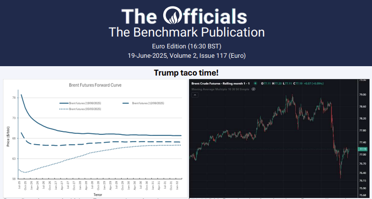 Brent flat price saw its highest European close since January at $78.80/bbl. But shortly after the close, Brent collapsed to near $76.50/bbl! ICE shut early for a mini break, but CME and Flux kept ticking too! What a TACO speech can do to oil prices. Trump will decide “within two weeks” whether to join Israel or not… Clearly, he doesn’t have a plan, and the threat of direct intervention by the US is rapidly evaporating.