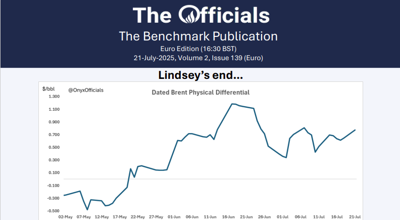 Midland was the hot commodity in the North Sea window today. Totsa was bidding for a 12-16 August cargo at Dated +$1.65, while Exxon bid a later 21-25 August cargo at $1.60 over Dated. PetroIneos offered 14-18 August at Dated +$1.95, but nobody wanted to take the leap and cross the spread. But Midland wasn’t the only grade on the menu today, as Unipec bid both a 5-18 August Forties at Dated +$0.75, while also bidding the same price for a 7-9 August Brent. Ekofisk was also up for grabs, as Phillips offered a 7-9 August cargo at Dated +$1.75 and Totsa bid 10-12 at $1.50 over Dated. Despite this plethora of offers, nobody came together to trade and the physical differential bounced to 77.5c.