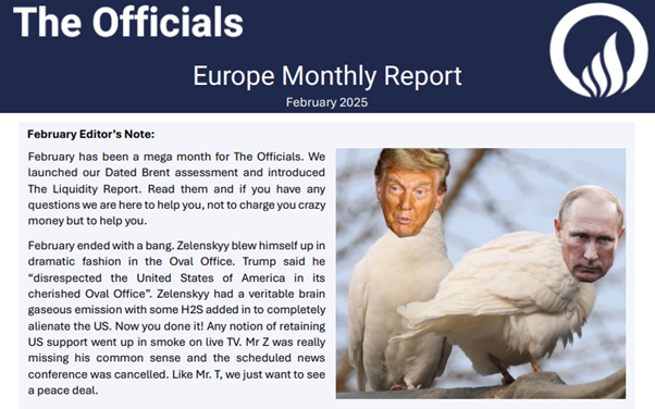 February has been a mega month for The Officials. We launched our Dated Brent assessment and introduced The Liquidity Report. Read them and if you have any questions we are here to help you, not to charge you crazy money but to help you.