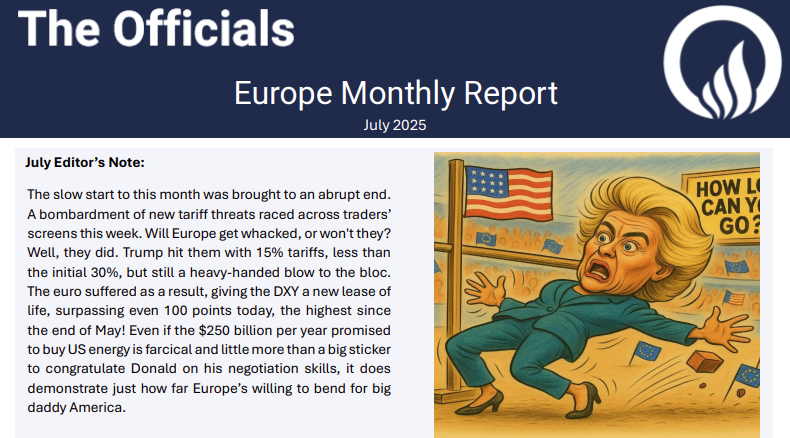 The slow start to this month was brought to an abrupt end. A bombardment of new tariff threats raced across traders’ screens this week. Will Europe get whacked, or won’t they? Well, they did. Trump hit them with 15% tariffs, less than the initial 30%, but still a heavy-handed blow to the bloc. The euro suffered as a result, giving the DXY a new lease of life, surpassing even 100 points today, the highest since the end of May! Even if the $250 billion per year promised to buy US energy is farcical and little more than a big sticker to congratulate Donald on his negotiation skills, it does demonstrate just how far Europe’s willing to bend for big daddy America.