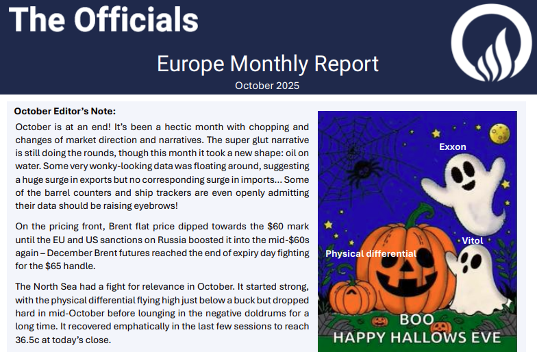 October is at an end! It’s been a hectic month with chopping and changes of market direction and narratives. The super glut narrative is still doing the rounds, though this month it took a new shape: oil on water. Some very wonky-looking data was floating around, suggesting a huge surge in exports but no corresponding surge in imports… Some of the barrel counters and ship trackers are even openly admitting their data should be raising eyebrows!