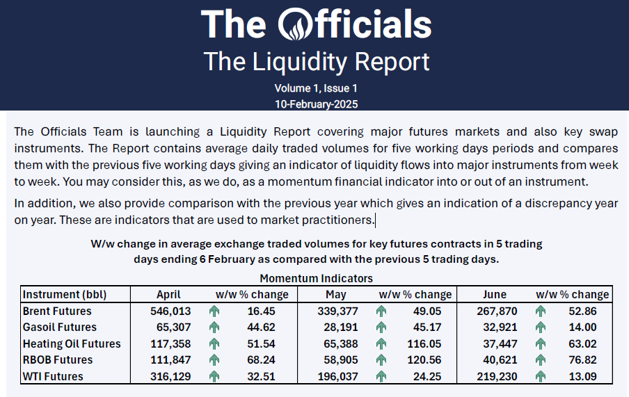 The Officials Team is launching a weekly Liquidity Report covering major futures markets and also key swap instruments, published each Monday. The Report contains average daily traded volumes for five working days periods and compares them with the previous five working days giving an indicator of liquidity flows into major instruments from week to week. You may consider this, as we do, as a momentum financial indicator into or out of an instrument. In addition, we also provide comparison with the previous year which gives an indication of a discrepancy year on year. These are indicators that are used to market practitioners.