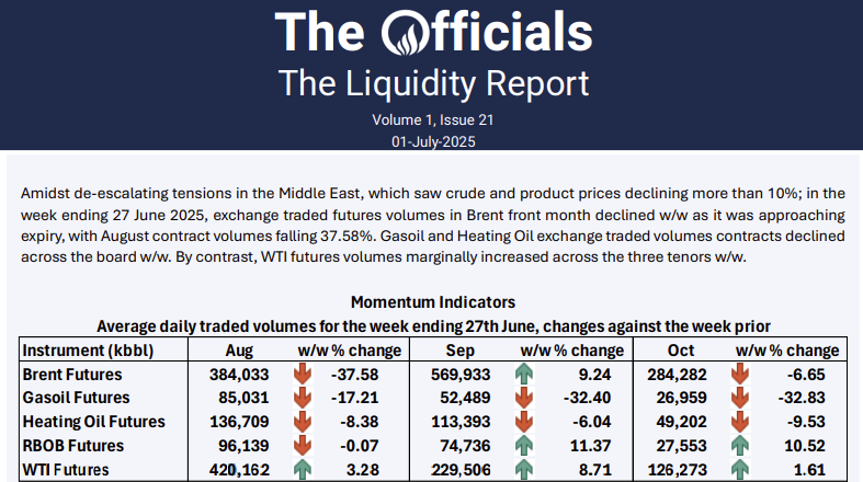 Amidst de-escalating tensions in the Middle East, which saw crude and product prices declining more than 10%; in the week ending 27 June 2025, exchange traded futures volumes in Brent front month declined w/w as it was approaching expiry, with August contract volumes falling 37.58%. Gasoil and Heating Oil exchange traded volumes contracts declined across the board w/w. By contrast, WTI futures volumes marginally increased across the three tenors w/w.