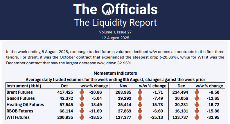 In the week ending 8 August 2025, exchange traded futures volumes declined w/w across all contracts in the first three tenors. For Brent, it was the October contract that experienced the steepest drop (-20.86%), while for WTI it was the December contract that saw the largest decrease w/w, down 32.95%.