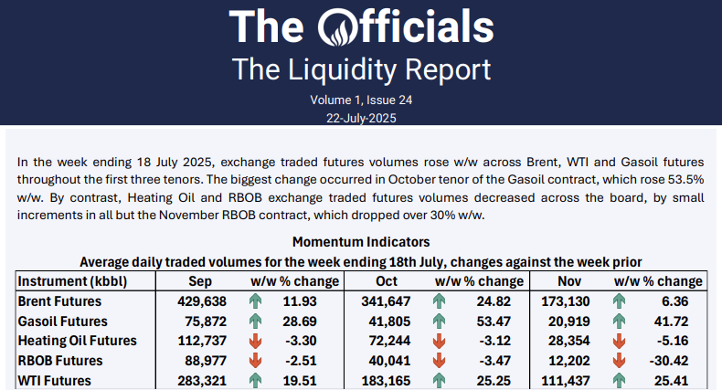 In the week ending 18 July 2025, exchange traded futures volumes rose w/w across Brent, WTI and Gasoil futures throughout the first three tenors. The biggest change occurred in October tenor of the Gasoil contract, which rose 53.5% w/w. By contrast, Heating Oil and RBOB exchange traded futures volumes decreased across the board, by small increments in all but the November RBOB contract, which dropped over 30% w/w.