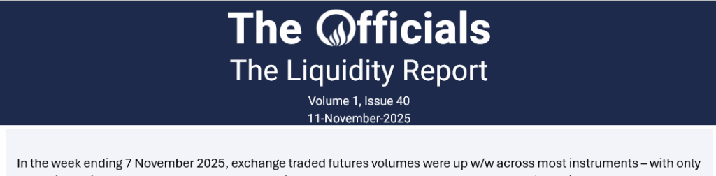 In the week ending 7 November 2025, exchange traded futures volumes were up w/w across most instruments – with only exception being Brent and WTI.