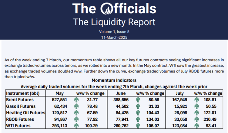As of the week ending 7 March, our momentum table shows all our key futures contracts seeing significant increases in exchange traded volumes across tenors, as we rolled into a new month. In the May contract, WTI saw the greatest increase, as exchange traded volumes doubled w/w. Further down the curve, exchange traded volumes of July RBOB futures more than tripled w/w.