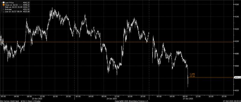 Equities began the week on a constructive note following productive US-China trade talks over the weekend. The discussions covered a broad range of topics, including export controls, shipping, fentanyl, and agriculture. China may resume “substantial” soybean purchases and defer its rare earths export controls for a year, while the extra 100% tariffs on Chinese goods threatened by Trump are likely off the table. The upbeat tone has raised hopes of an extended trade truce, creating a positive framework ahead of Thursday’s high-stakes summit between Trump and Xi. The sanguine tone weighed on gold as prices extended its decline, retreating by 1% on Monday morning (Chart 1, Bloomberg)