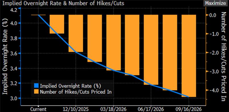 US inflation has hit 3% for the first time since January last month; however, this was less than the expected 3.1%. The inflation figures resulted in a ‘dovish cut’ tone, driving the S&P 500, Nasdaq, and Dow Jones to new all-time highs. A 25bps cut is all but priced in for this week’s Fed meeting, to bring the rates down to a 3.75% to 4% range (Chart 3, Bloomberg). The odds of a December rate cut have been raised from 91% to 98.5%, according to the CME FedWatch tool. Nonetheless, the US 2-year and 10-year Treasury yields remained sticky at the 3.5% and 4% levels, respectively.