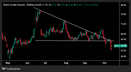 Brent’s 10 Oct sell-off followed renewed US-China trade tensions, after Beijing launched an antitrust probe into Qualcomm, imposed new port fees on US-owned vessels, and restricted exports of certain battery components. Although China’s actions were in response to the US Bureau of Industry and Security extending export restrictions on subsidiaries that are owned 50% or more by entities under US export controls and sanctions lists, the Trump administration responded with 100% tariffs on Chinese exports to the US and new export controls on “all critical software” effective 1 Nov. Over the weekend, conciliatory comments from both sides sparked “TACO” speculation, lifting S&P 500 mini futures +1.46% d/d, though still below pre–10 Oct levels. Brent futures also rebounded, but traders await clearer signs of easing tensions.