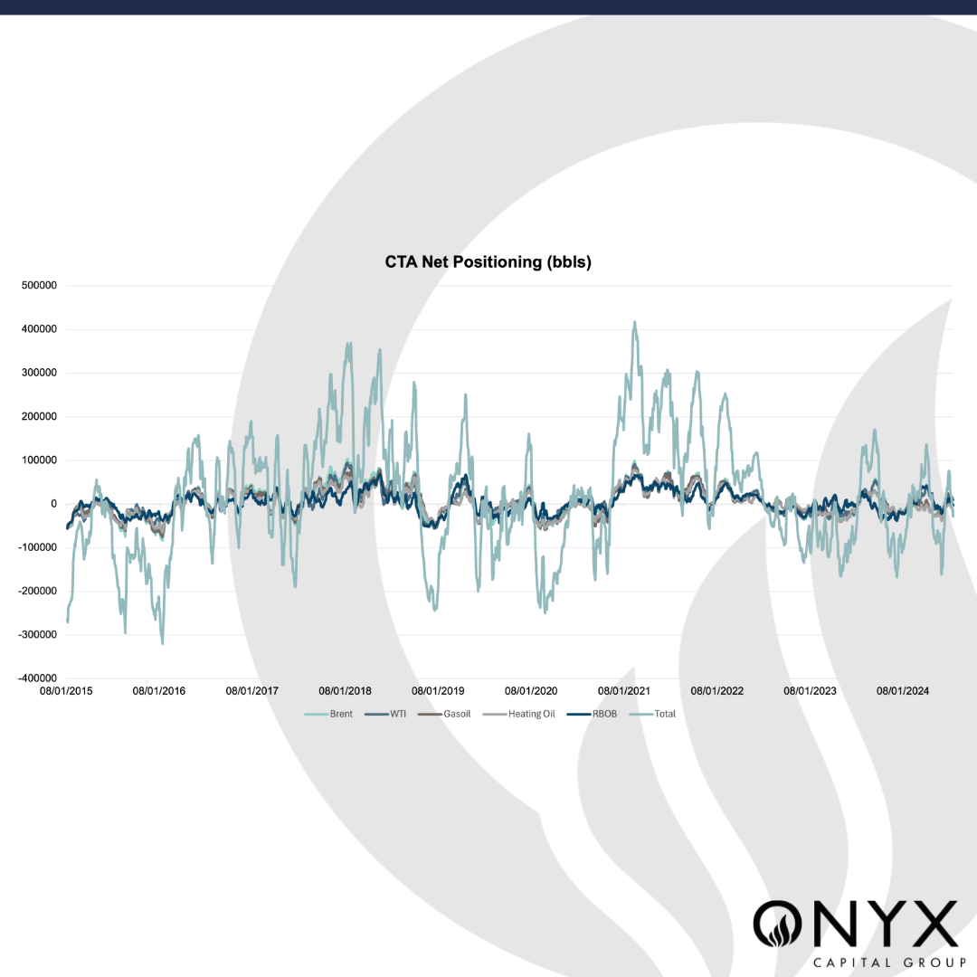 ICE COT data for the week to 16 July showed an increase in sell-side positions from managed by money players. Bullish funds increased their position by just 500kb, compared to the 18.6mb increase in short positions. Money managers’ net positioning fell over 18mb in the week, leaving the market more balanced. Interestingly, this is the fourth consecutive week that both long and short prod/merc players have removed risk in Brent – which is also contributing to low interest and a potentially thin market. Sep’24 is seeing an OI under 400mb on 18 July, although players are likely beginning to focus on Oct’24. The Onyx CTA model estimates that the total net positioning for a selection of futures has fallen into negatives. There is a chance that it may continue to plough down into deep negatives with the CTA selling momentum that has driven the market a few times this year, or it may steady out and leave room for a more balanced market.