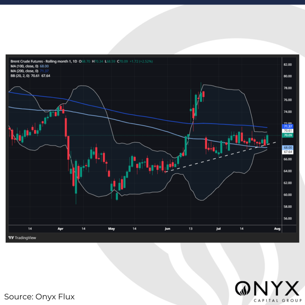 Last week, Brent was lacklustre, as predicted. This week, we expect much of the same, albeit progress in US trade deals could give oil some pep. Trade deals were recently made with the EU and Japan. The S&P500 was lifted to over 6,400 on Sunday night following the halving of European tariffs. We expect support in the stock market, from progress on trade deals, to spill into the crude markets. This is currently the main ‘outside’ force on the market sentiment, but technical and fundamental headwinds and the lack of clarity in the China-US trade deal may be preventing support. We expect the themes below to guide price direction and support M1 Brent to settle the week between $69-71/bbl. Key factors this week include:
