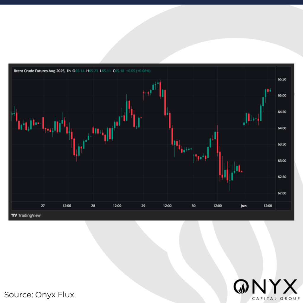 Aug’25 Brent crude futures opened higher at $64/bbl on Monday morning, nearly $1.50 up on Friday’s close. This comes following heightened geopolitical risk as Ukraine launched attacks on Russian airfields and an IAEA report indicating a recent Iranian buildup of its near weapons-grade stockpile. Given the confluence of both bullish and bearish factors, we anticipate crude oil prices to be rangebound and finish this week between $63 and $67/bbl. The key factors affecting price action this week include: